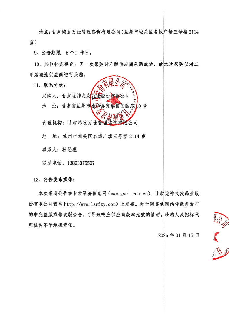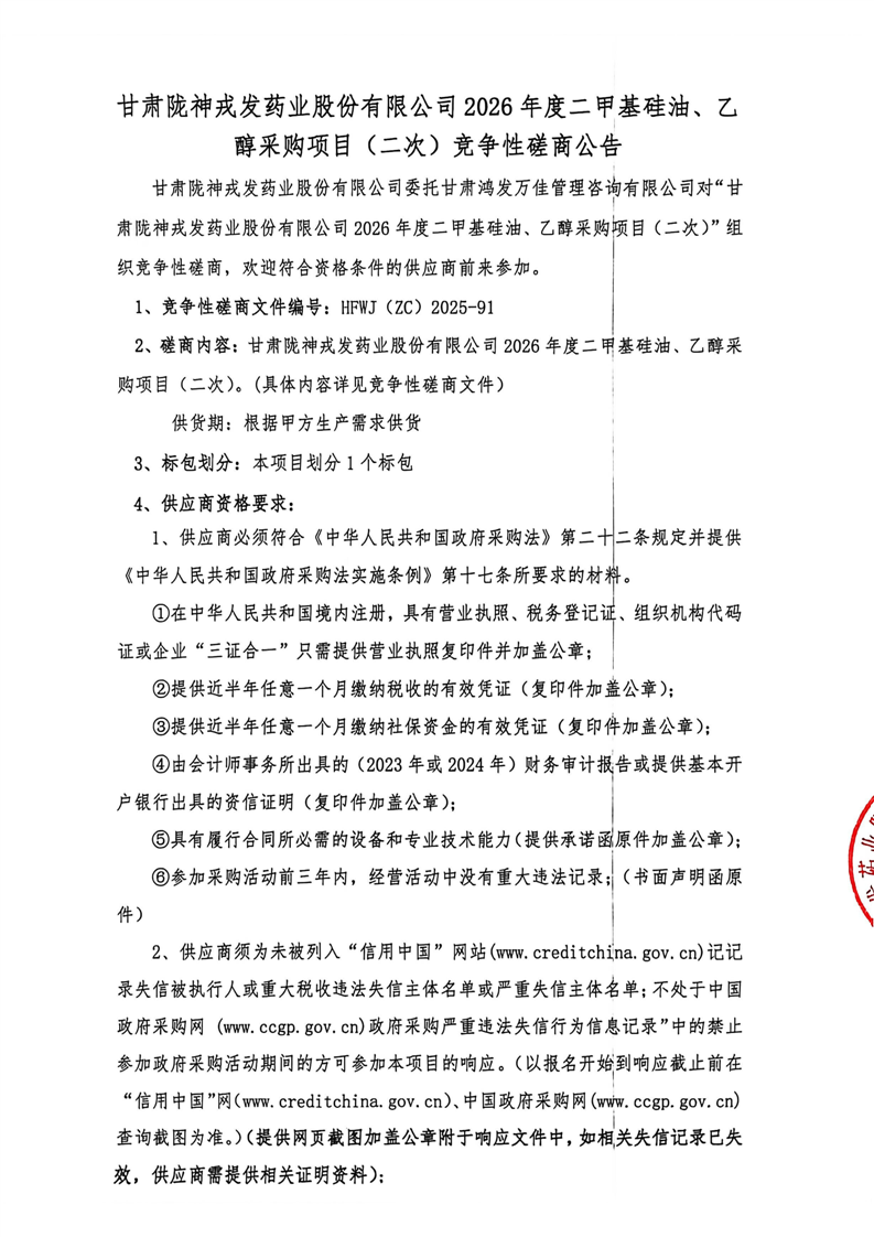 甘肅隴神戎發(fā)藥業(yè)股份有限公司2026年度二甲基硅油、乙醇采購項目(二次)競爭性磋商公告